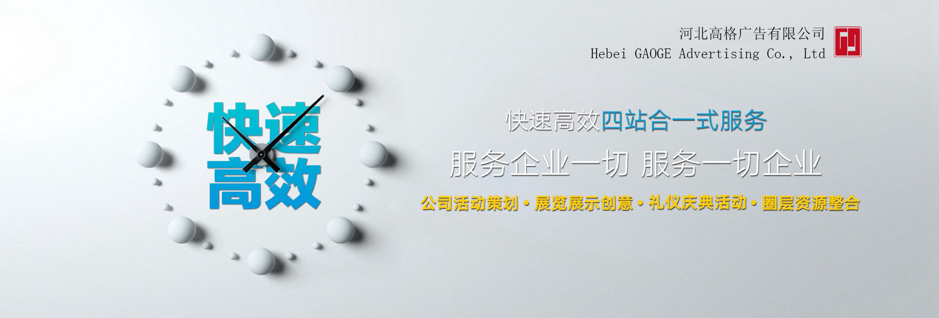 河北高格廣告有限公司是一家專業(yè)致力于大型文化活動組織策劃、展覽展示工程策劃、展臺設(shè)計制作、特裝展臺搭建、會議會場布置、巡回展覽、路演、公關(guān)推廣執(zhí)行、會議慶典禮儀、路演設(shè)備租賃、倉儲等一站式的專業(yè)服務(wù)公司。本公司憑借創(chuàng)新領(lǐng)先的服務(wù)理念,大型的廠房空間,現(xiàn)代化的機械設(shè)備,高素質(zhì)專業(yè)的服務(wù)團隊,及在該行業(yè)多年的實戰(zhàn)經(jīng)驗,為地產(chǎn)營銷提供了優(yōu)秀的活動方案、為不同行業(yè)的數(shù)千家企業(yè)提供了專業(yè)個性化的空間展示方案,幫助客戶實現(xiàn)了自我品牌的提升和企業(yè)利潤的雙贏。...